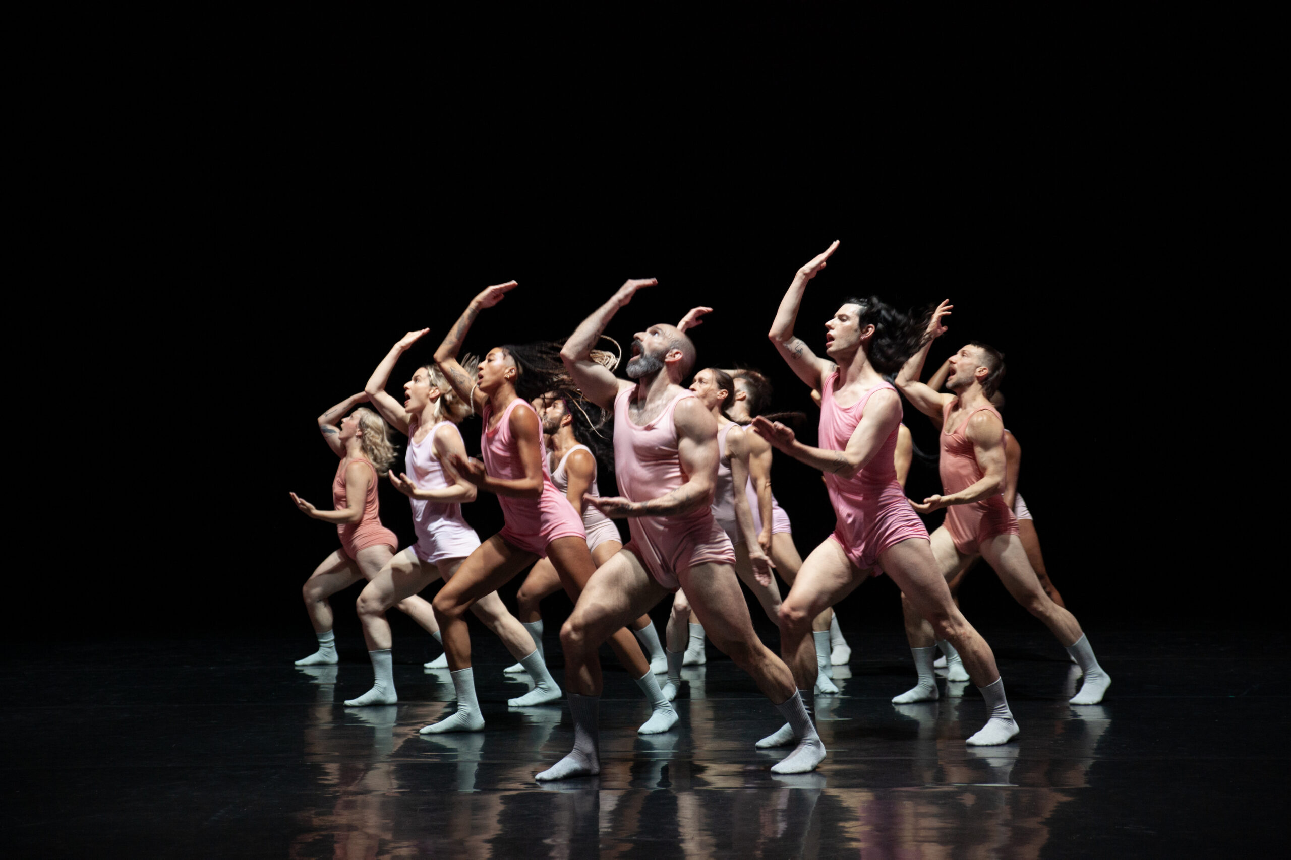 Perfect harmony becomes an ominous signifier of the danger of deviation from sanctioned social norms. Stray but a foot, and destruction awaits. But as the performers enforced unity begins to come apart, voices break, bodies stagger, the endpoint lurches into view. The brutalizing demand for obedience and orthodoxy crushes individual need and expression underfoot. Exhaustion is inescapable, but lingering at the edge is another form of being. Rooted deep in shared struggle, a slender blade of hope emerges, tender as a newborn.