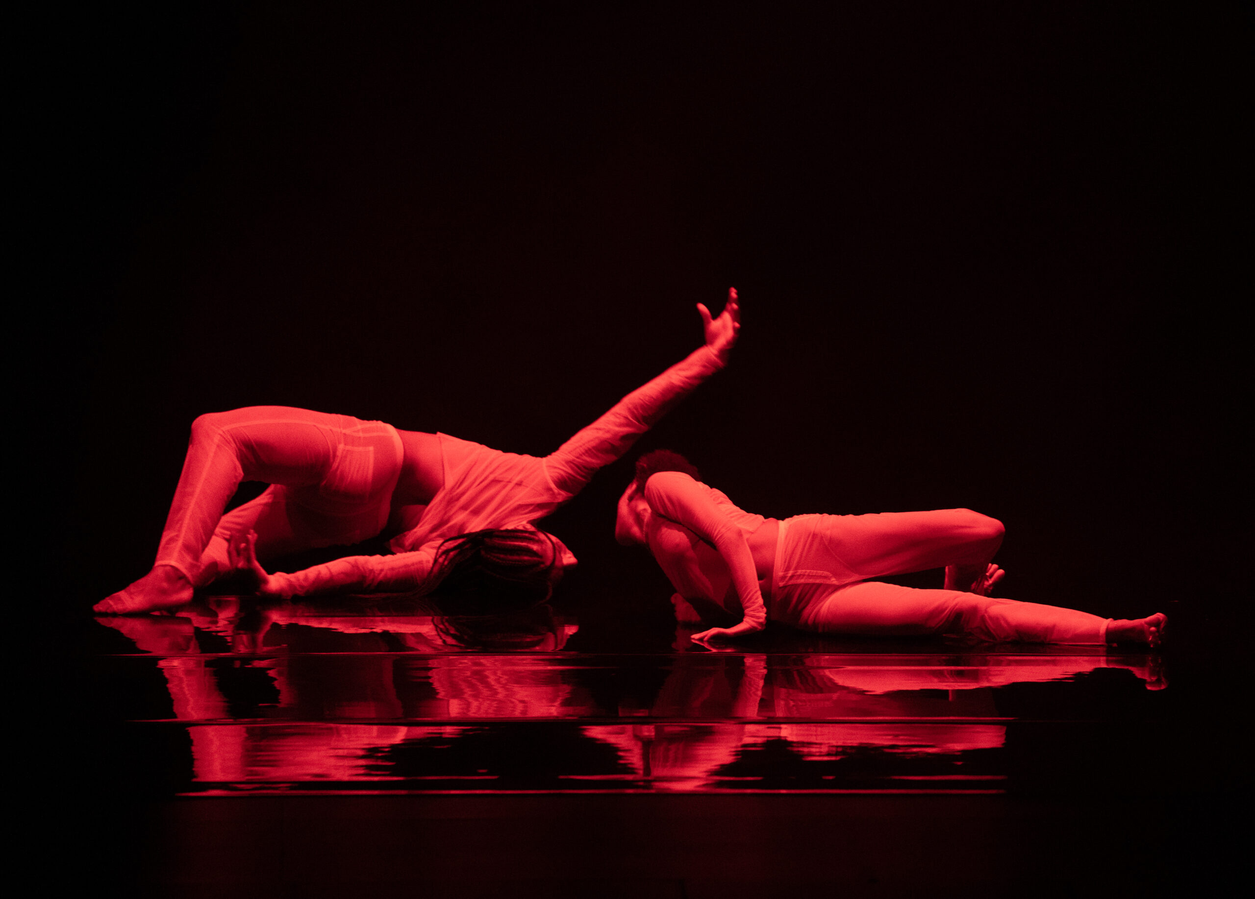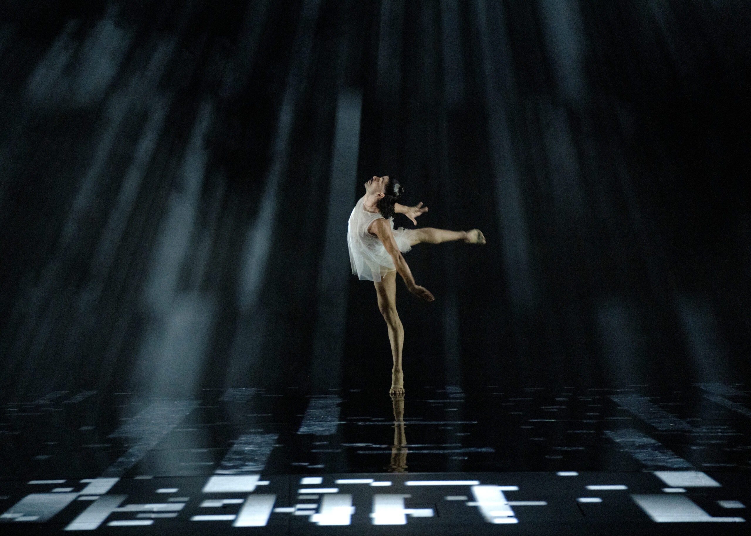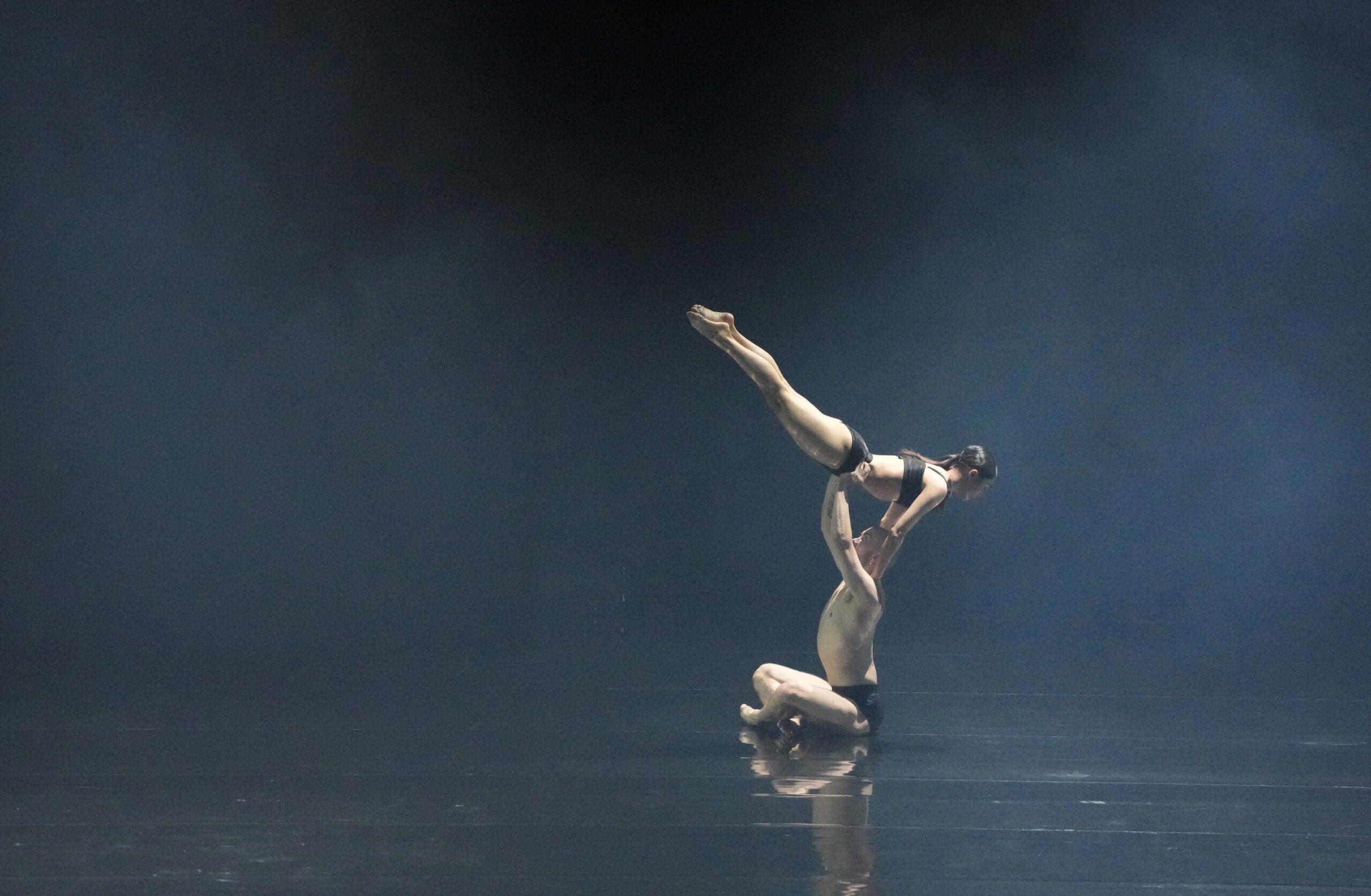 Through movement phrases that recall the peristaltic motion of undersea creatures, the performers give expression to the existential experience of the void. In summoning ultimate dark, the work utilizes Vantablack Vision technology, an industrial material capable of absorbing 99.9% of light. The abyss at the centre of the work is balanced and matched by Oscar-winning sound designer Nicolas Becker and LEXX who implement Bronze AI, a digital audio engine that unfolds in fluid fashion in reaction to the performance itself.