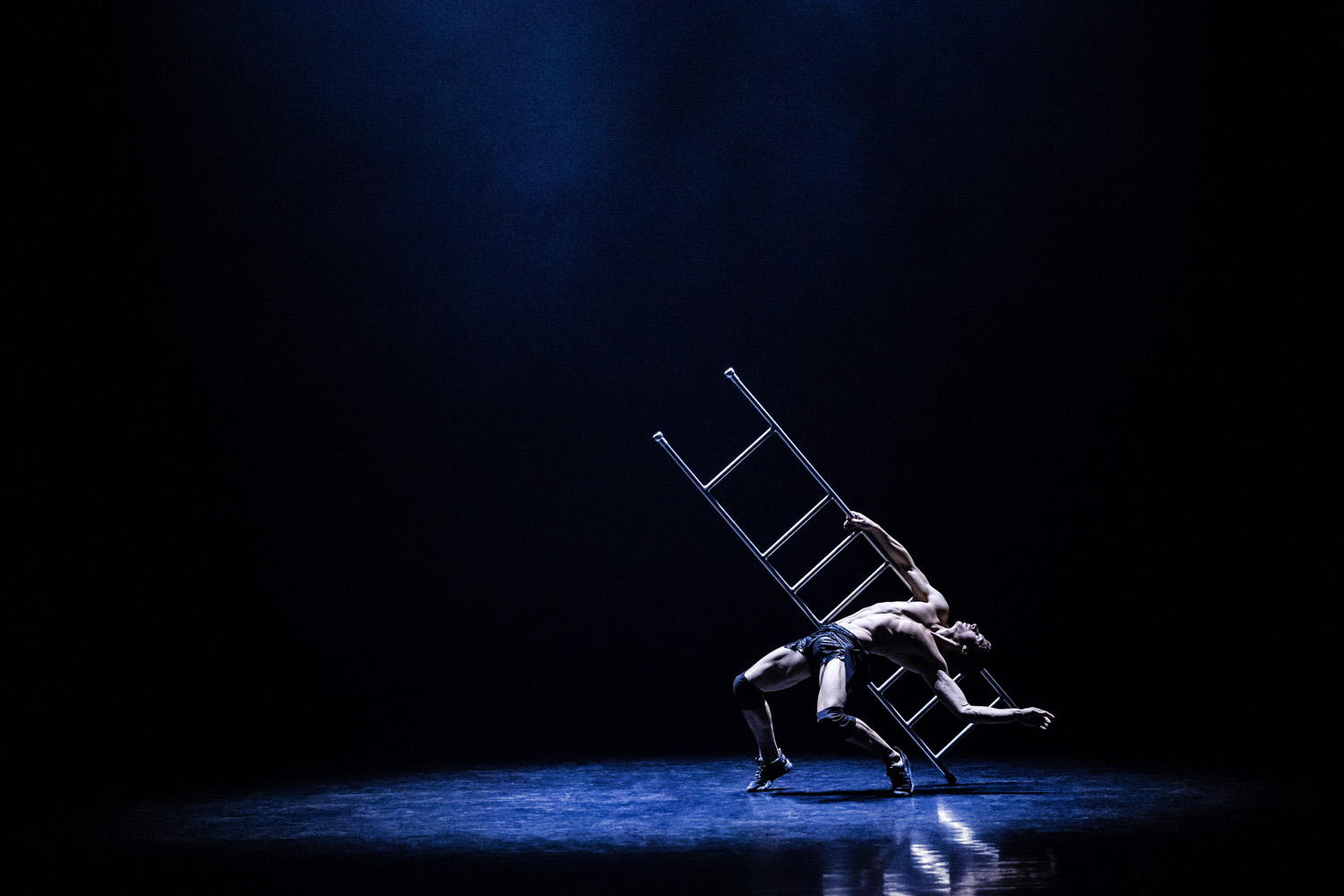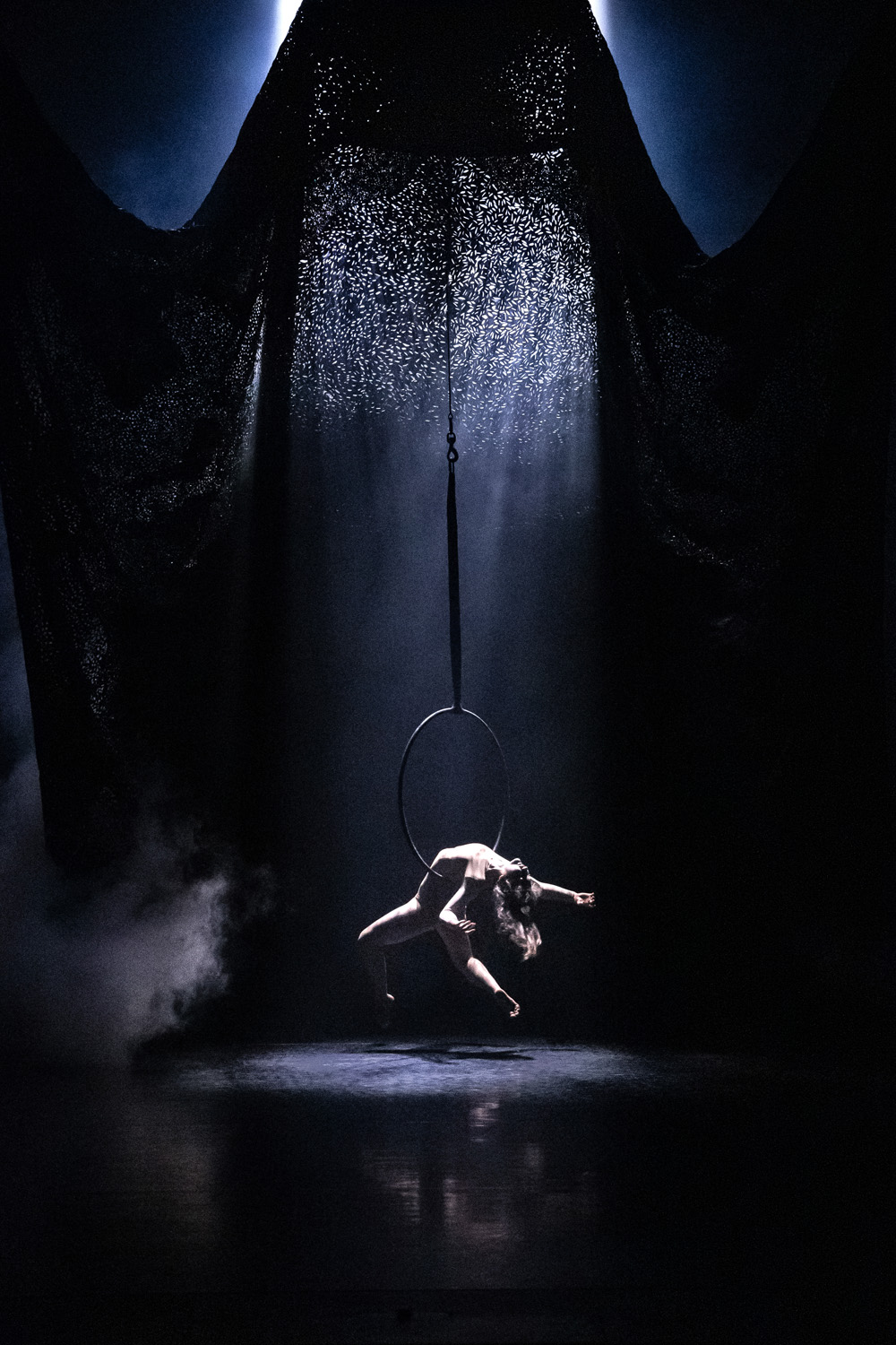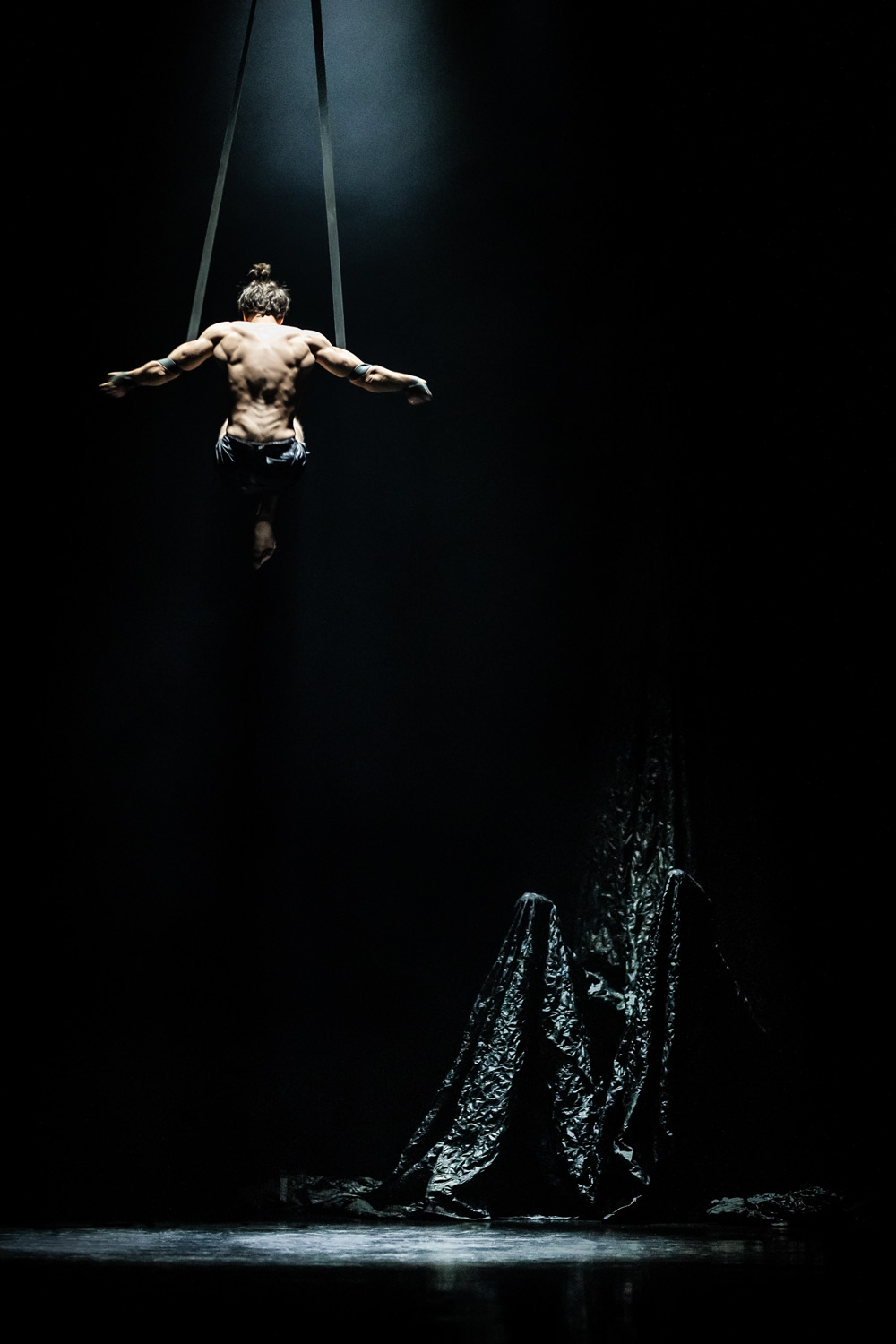 With its reference to a post-apocalyptic world, Paradisum summons archetypal figures, each engaged with the overwhelming effort of existence. Elevating aerial and groundwork, elements of stagecraft — a rippling black drape, a ladder, rings, a hoop — create otherworldly vistas. Underpinning the larger cosmological ideas with concrete manifestations, the work is both deeply grounded in the earth and yet defiant of gravity.