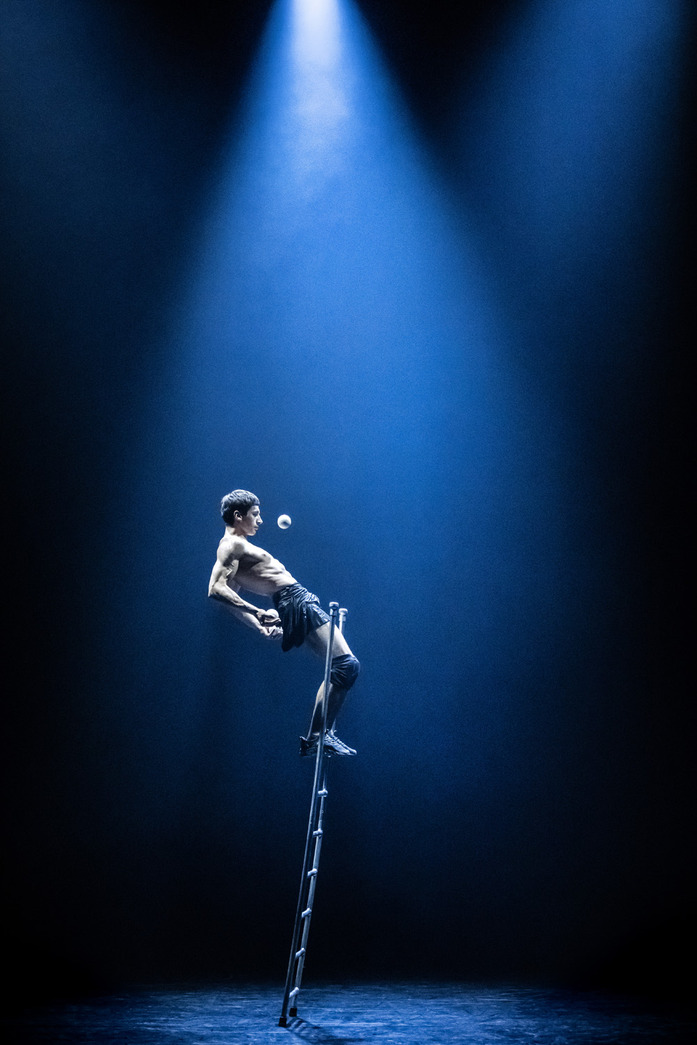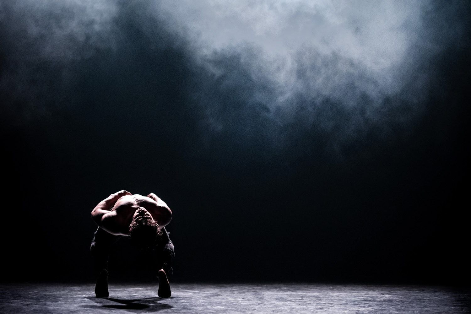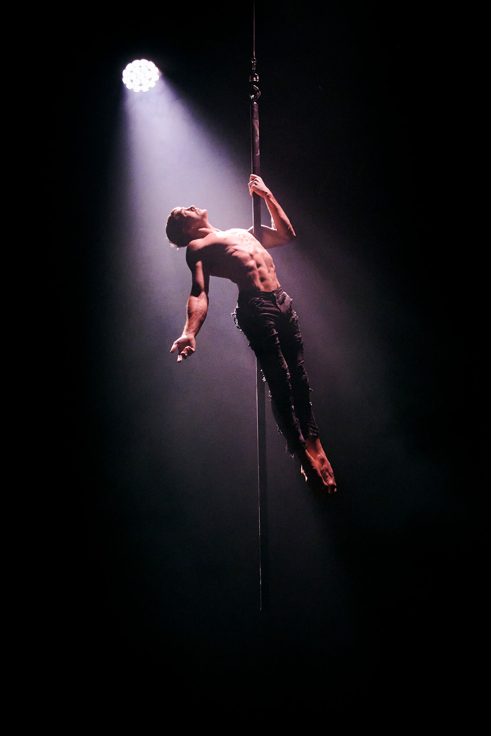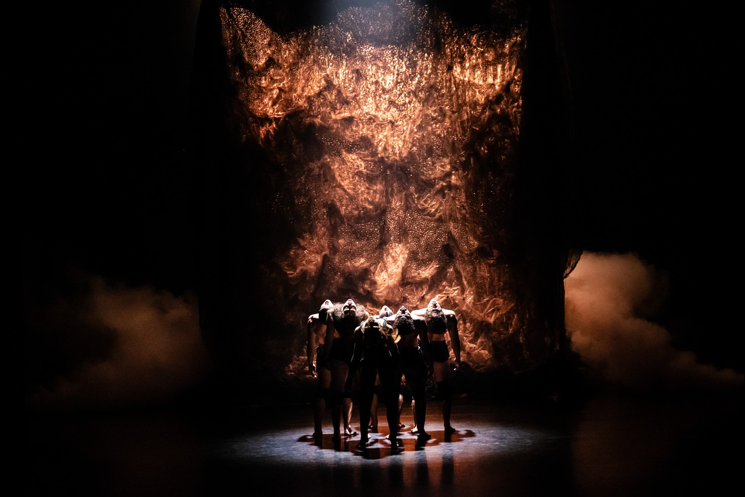 With its reference to a post-apocalyptic world, Paradisum summons archetypal figures, each engaged with the overwhelming effort of existence. Elevating aerial and groundwork, elements of stagecraft — a rippling black drape, a ladder, rings, a hoop — create otherworldly vistas. Underpinning the larger cosmological ideas with concrete manifestations, the work is both deeply grounded in the earth and yet defiant of gravity.